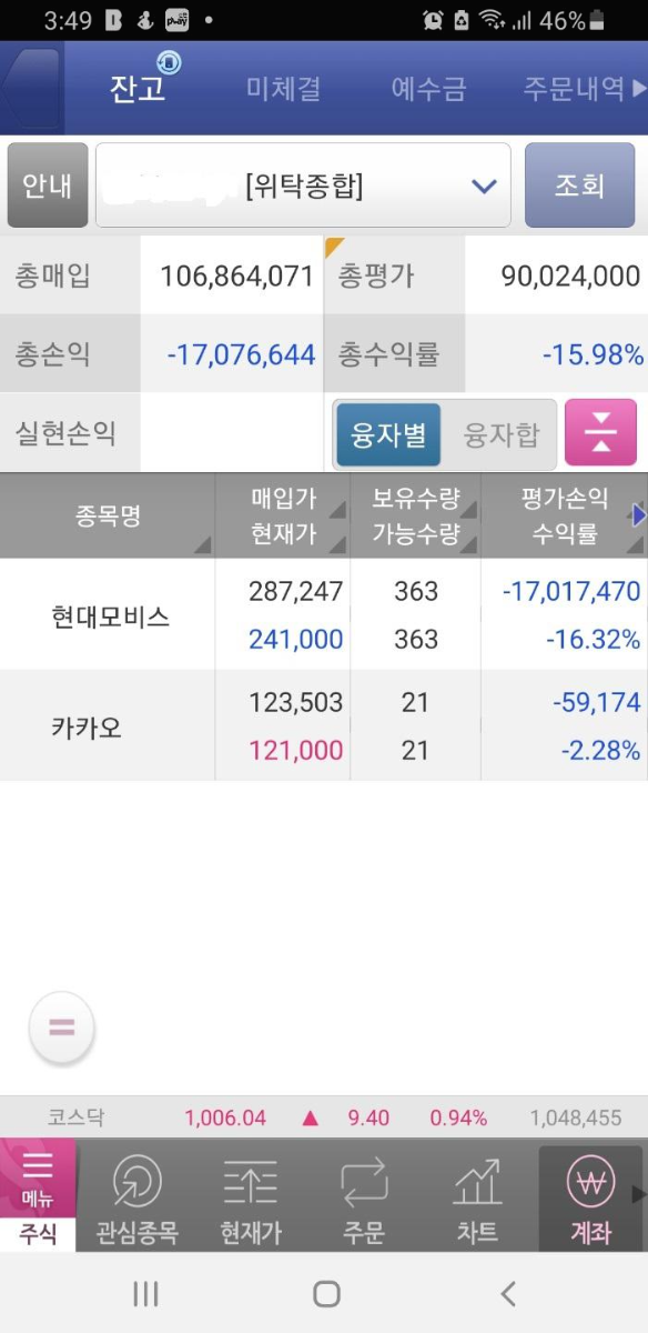 현대모비스 물리고 카카오 들어갈때도 조금씩 분할 매수해서 그래도 카카오 보유중에는 최악의 수익률이