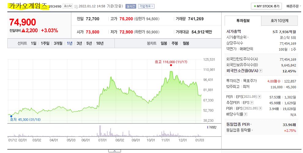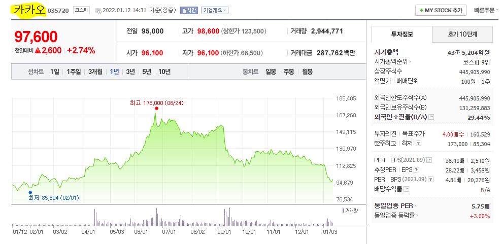 2022년 1월 12일 장중 기준 시가총액 43조 5,504억원이고