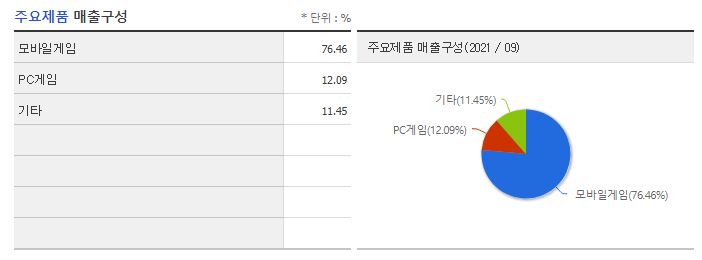 카카오게임즈 주사업 매출 구조로는 모바일게임76,46%, PC게임12.09%, 기타 11.45% 등