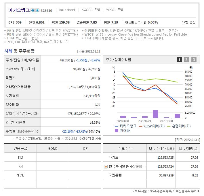 카카오뱅크 IPO 상장 열풍이 생긴 종목이다. 그후 주가는 기대감 하락으로
